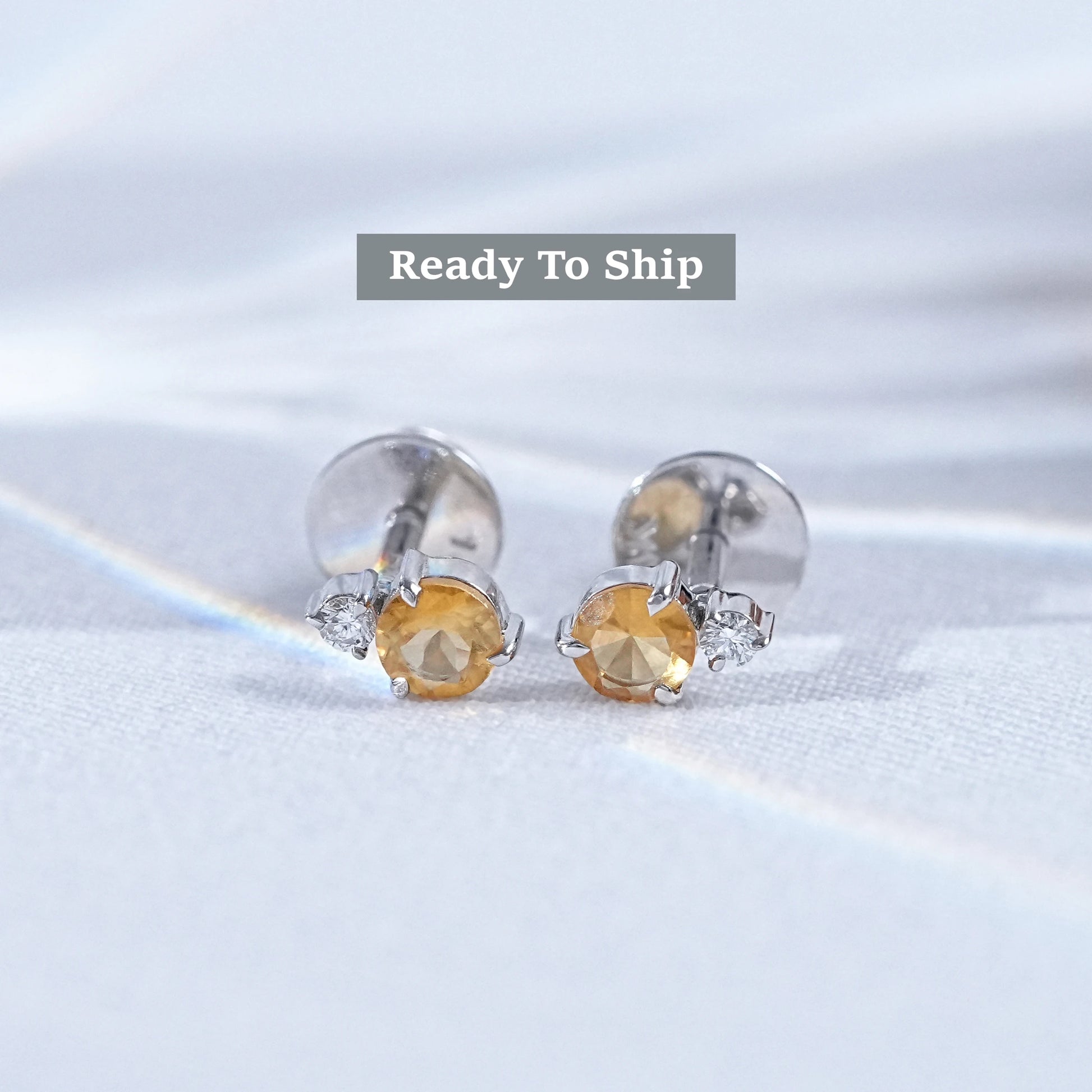 Elegant stud earrings showcasing vibrant round-cut citrine gemstones and sparkling lab-grown diamonds, set in luminous 14K white gold for a timeless touch.