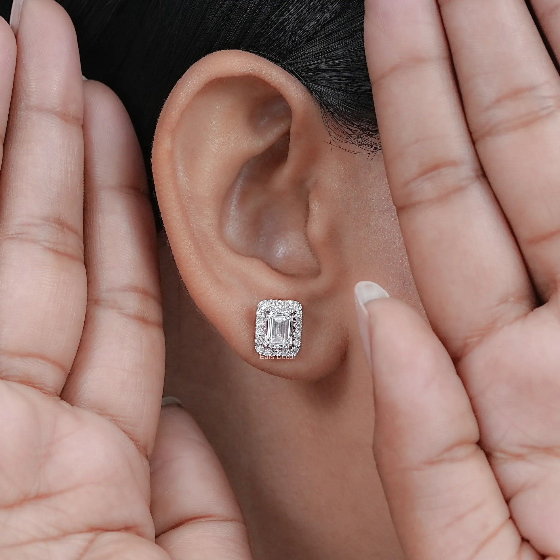 Stunning halo stud earrings showcasing radiant emerald-cut lab-grown diamonds, framed by a shimmering halo for a classic and sophisticated touch.