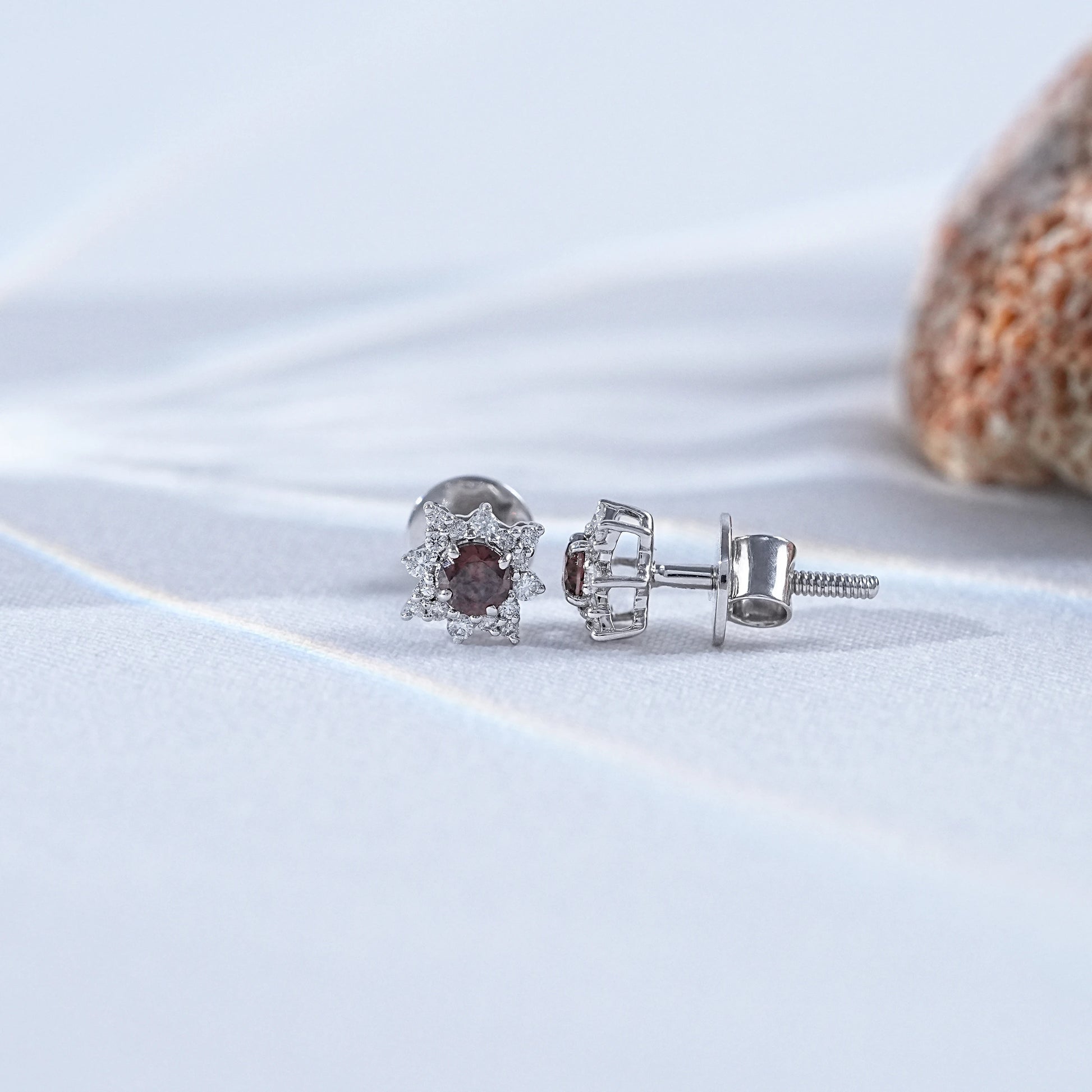 Stunning cluster stud earrings featuring vibrant garnet gemstones and sparkling lab-grown diamonds, set in elegant white gold for a timeless look.