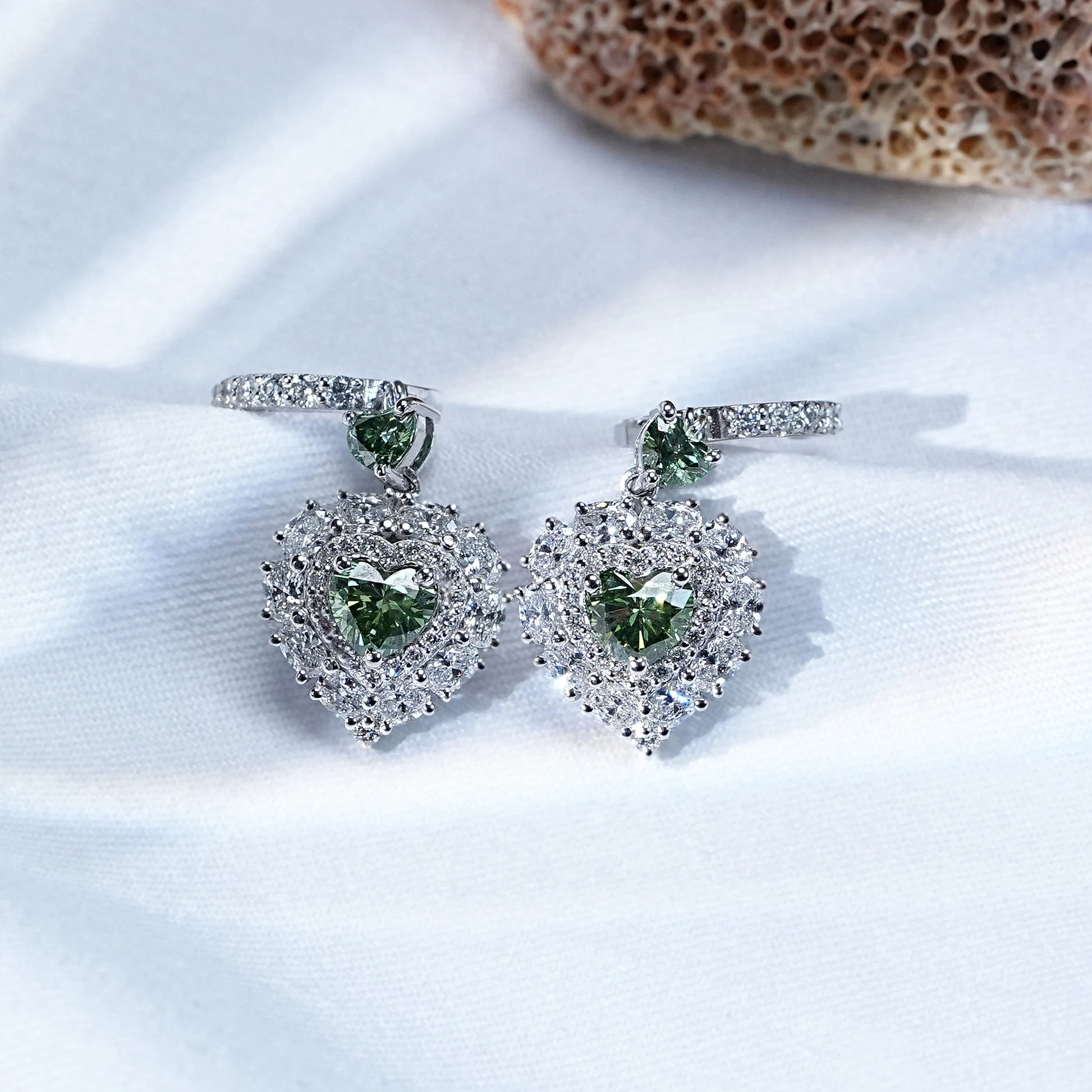 Elegant dangle earrings featuring vibrant heart-shaped green lab-grown diamonds, surrounded by a shimmering halo for a timeless and sophisticated look.