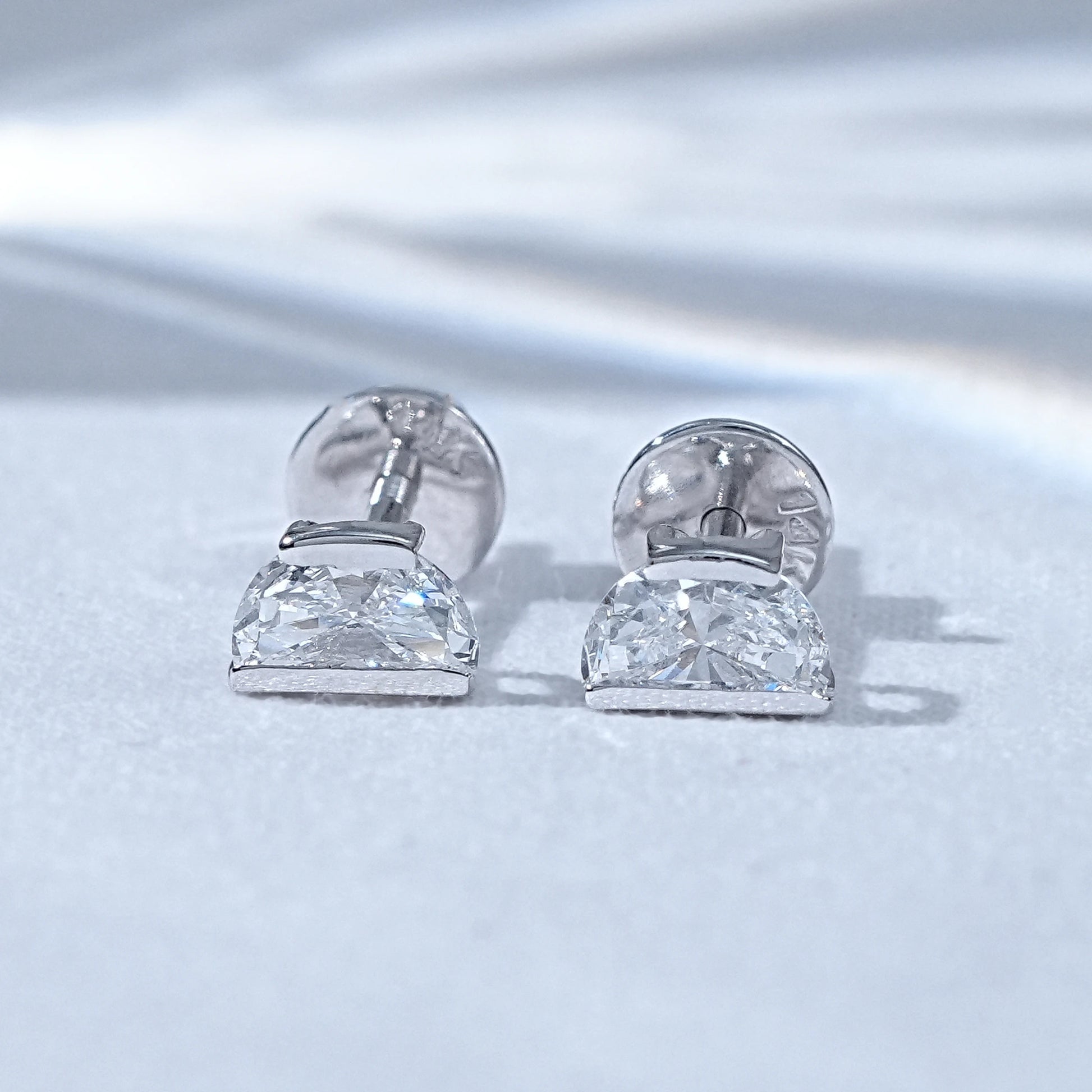 Sleek and modern Half Moon Lab Diamond Stud Earrings, showcasing a unique crescent shape with brilliant sparkle. Perfect for a chic, minimalist statement.