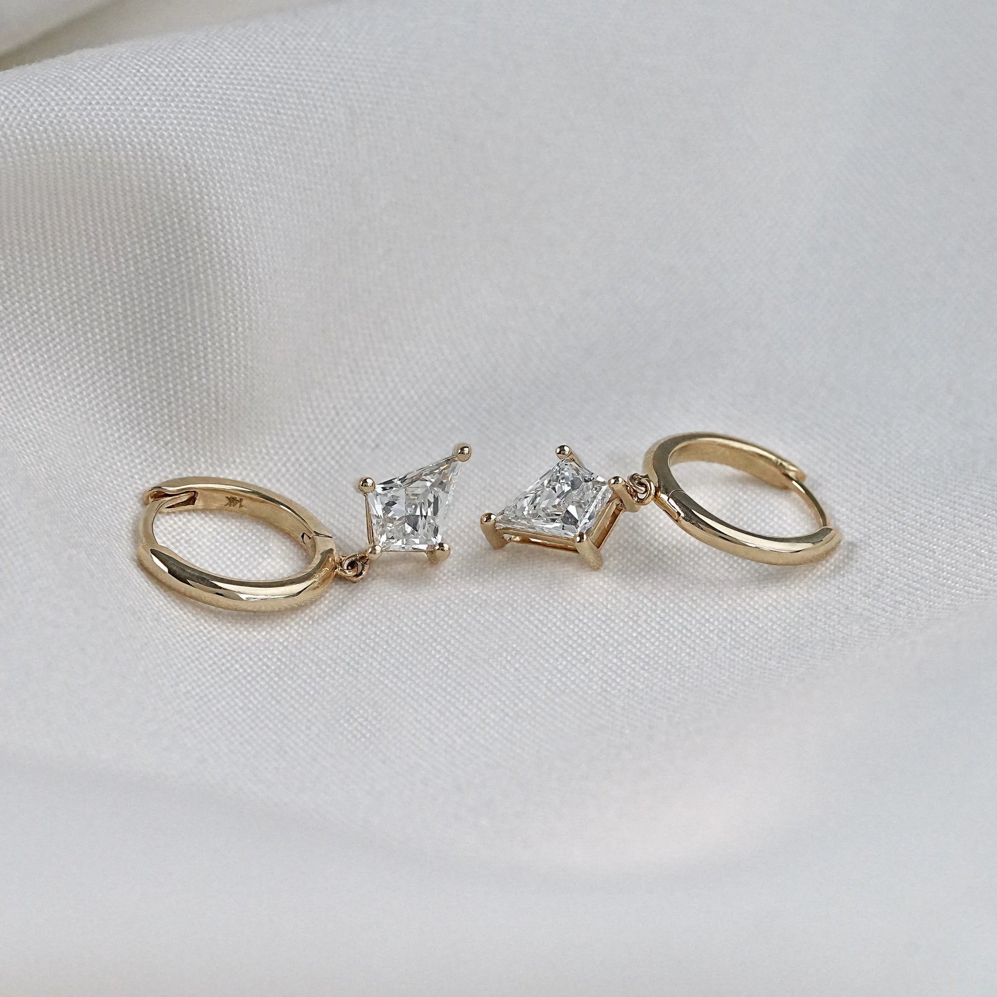 Elevate your style with these Kite Cut Diamond Drop Hoop Earrings. Featuring exquisite kite-shaped diamonds dangling from sleek hoops, they combine elegance and modern sophistication for a timeless look.