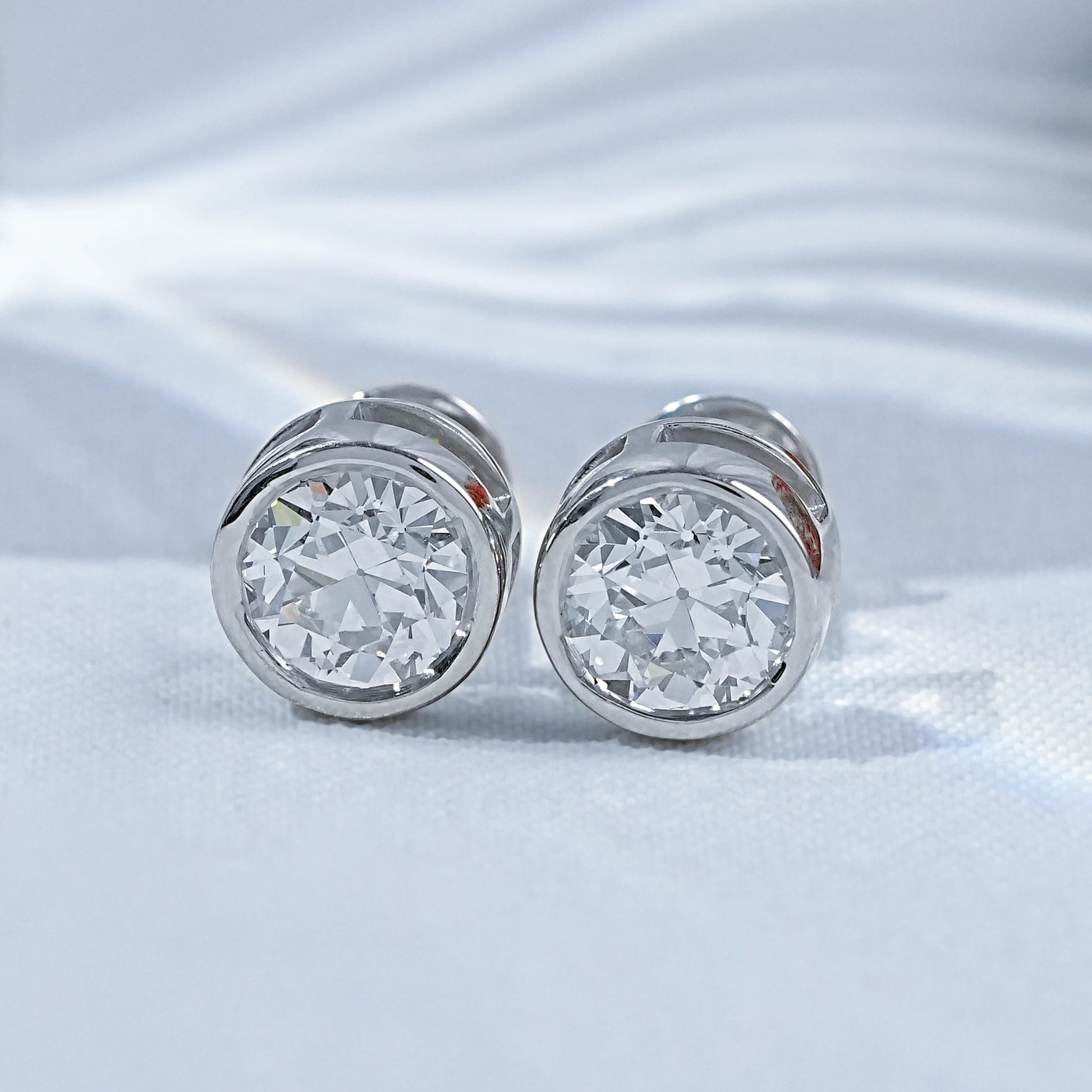 Timeless Old European round cut lab diamond earrings in smooth bezel settings for lasting style.