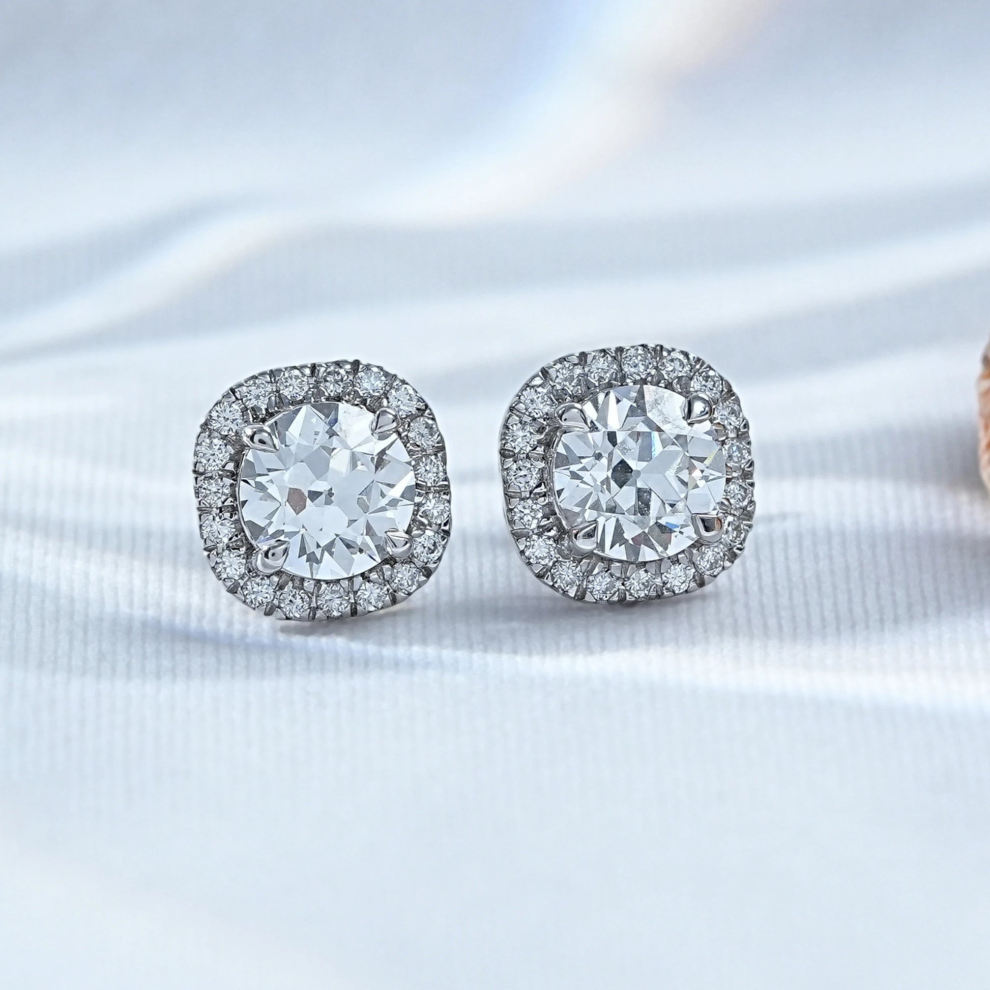 Elegant vintage-inspired halo stud earrings featuring dazzling lab-grown Old European round-cut diamonds, encircled by a shimmering halo for a timeless and sophisticated look.