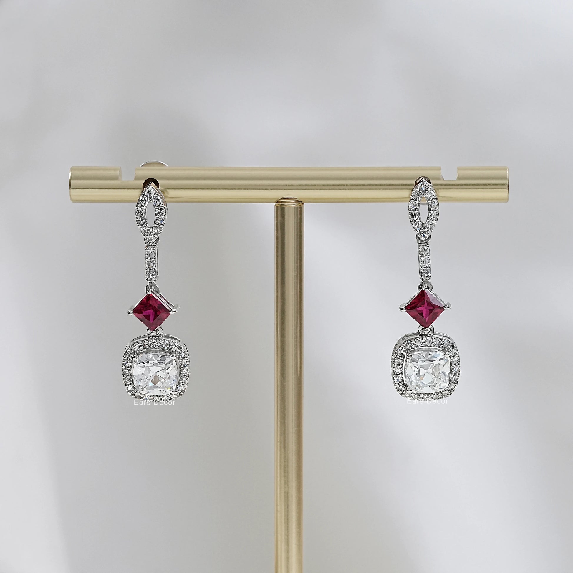 Vintage-inspired Old Mine Cushion Cut Halo Dangle Earrings, crafted with a sparkling halo and graceful drop design for timeless elegance and charm.