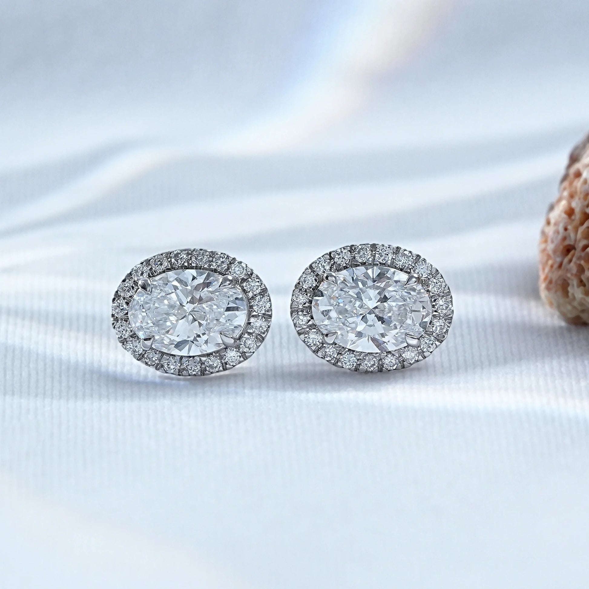 Sophisticated halo earrings featuring dazzling oval-cut lab-grown diamonds, surrounded by a shimmering halo for a timeless and elegant look.