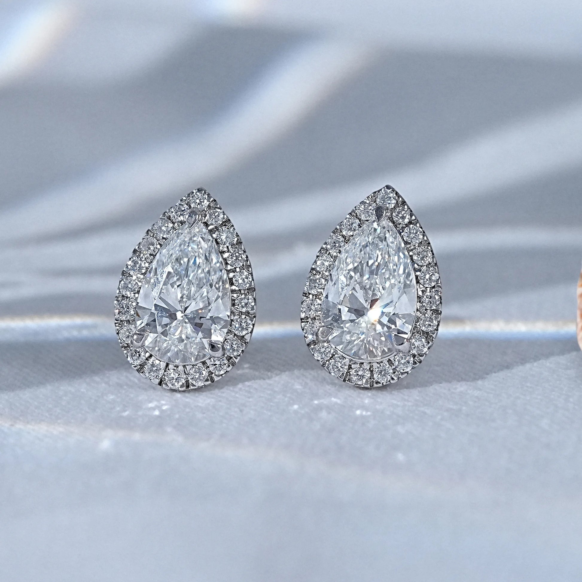 Elegant halo stud earrings featuring dazzling pear-cut lab-grown diamonds, surrounded by a sparkling halo for a timeless and sophisticated look.