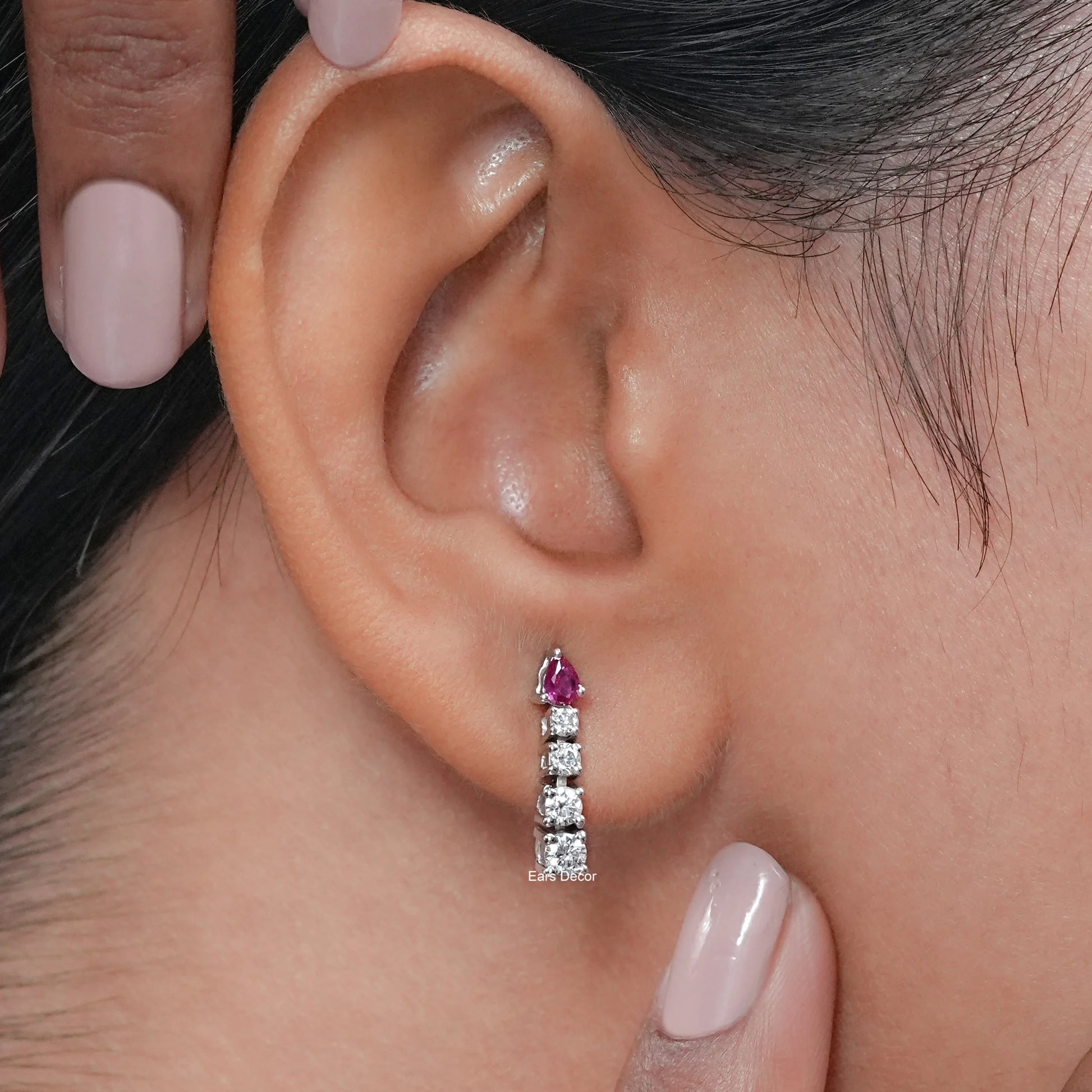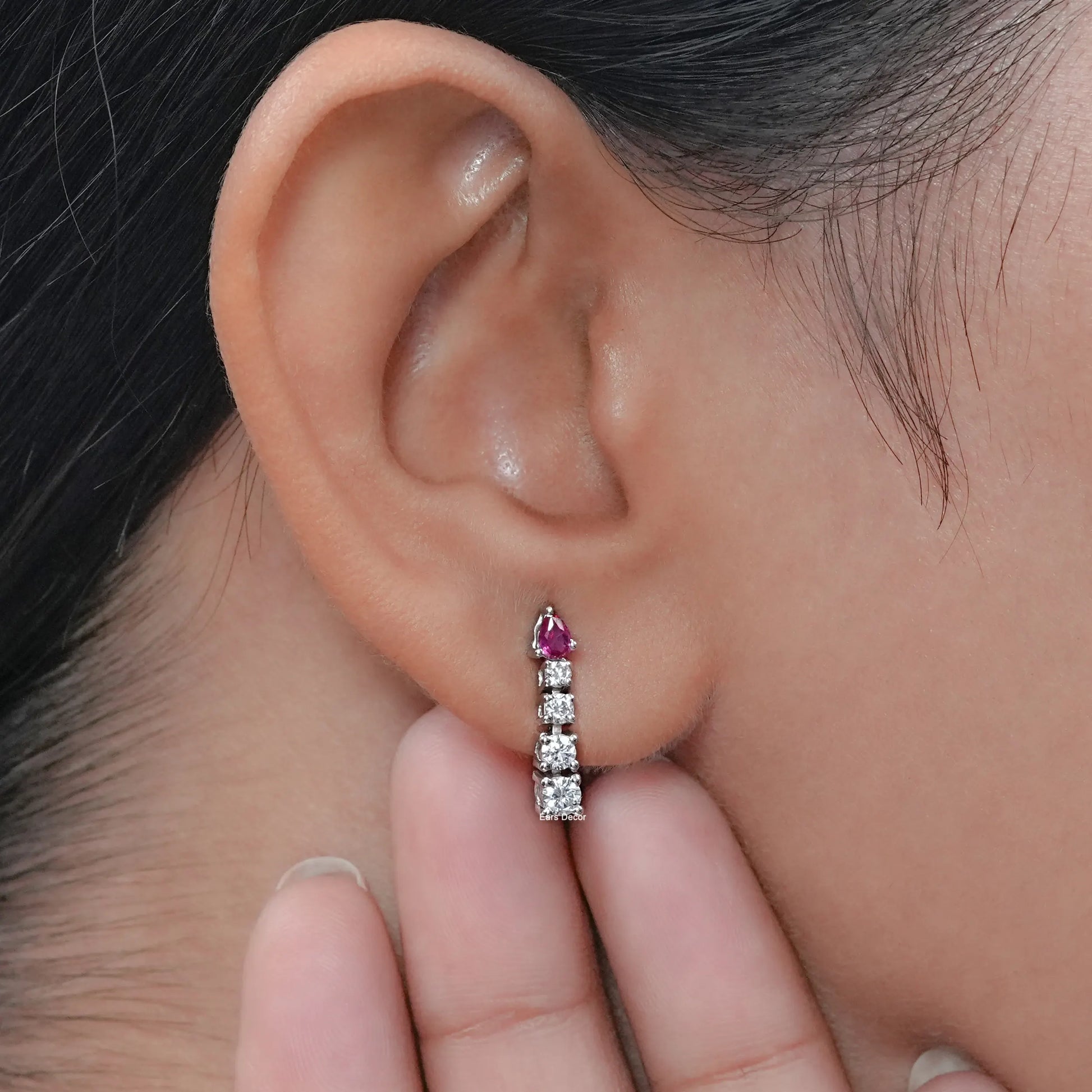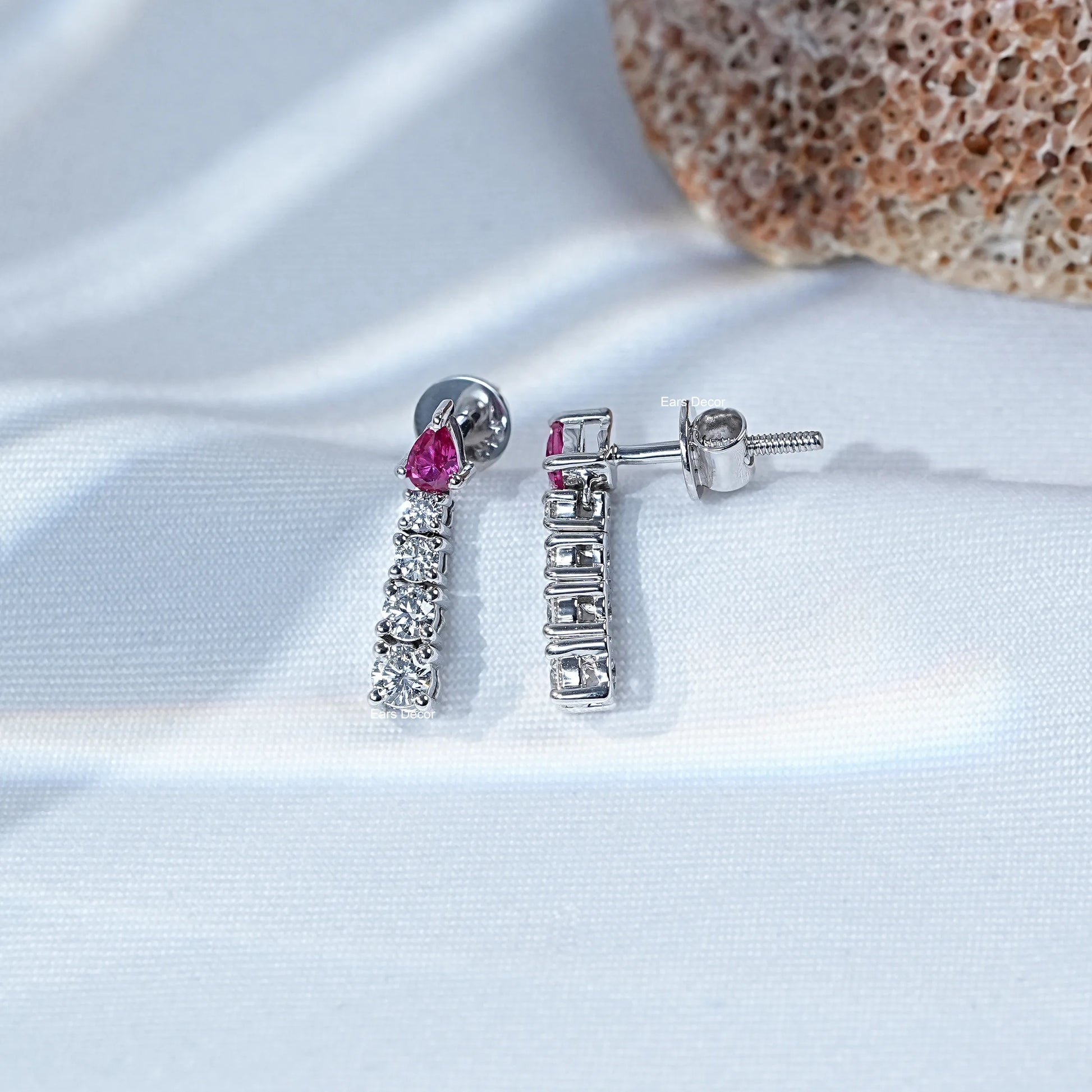 Stunning Pear Ruby and Round Diamond Tennis Earrings, blending vibrant red gemstones with sparkling diamonds in a graceful, timeless design.