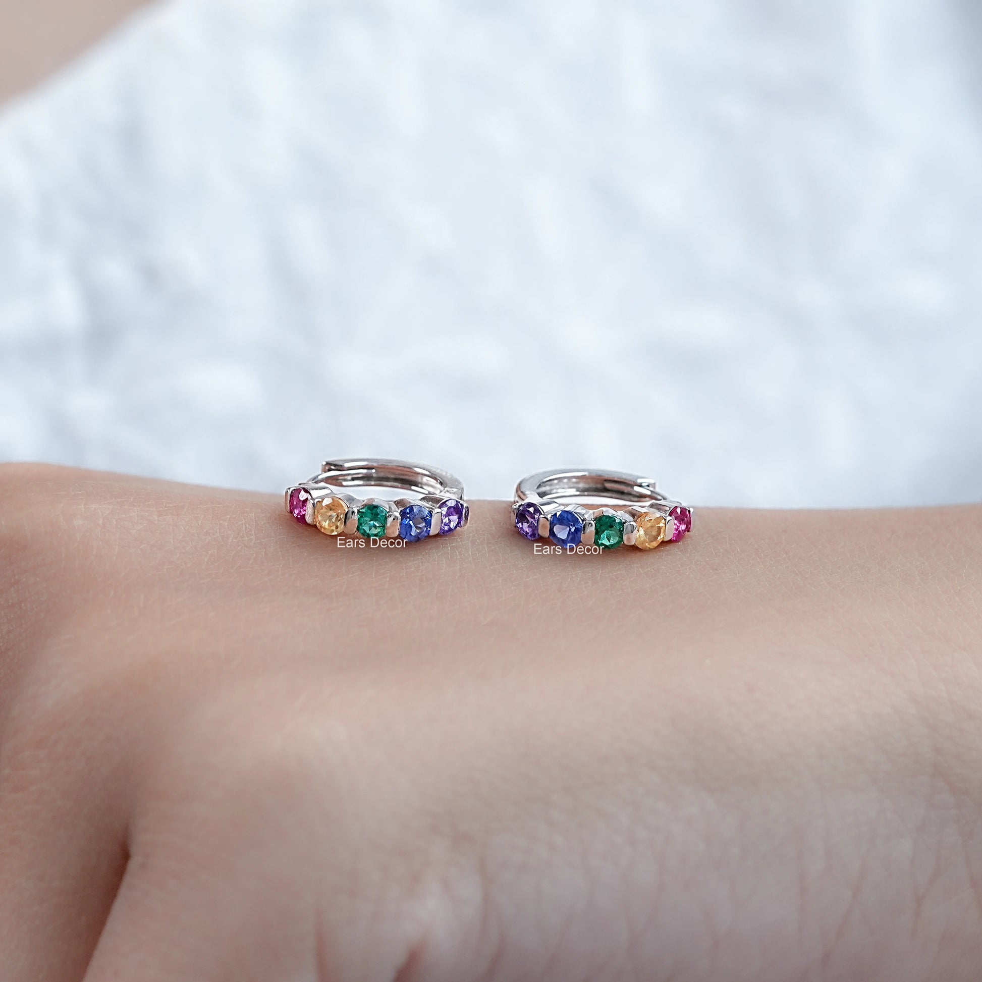 Colorful Round Cut Rainbow Gemstone Hoop Earrings, featuring a vibrant spectrum of stones for a playful yet elegant look—perfect for brightening any style.