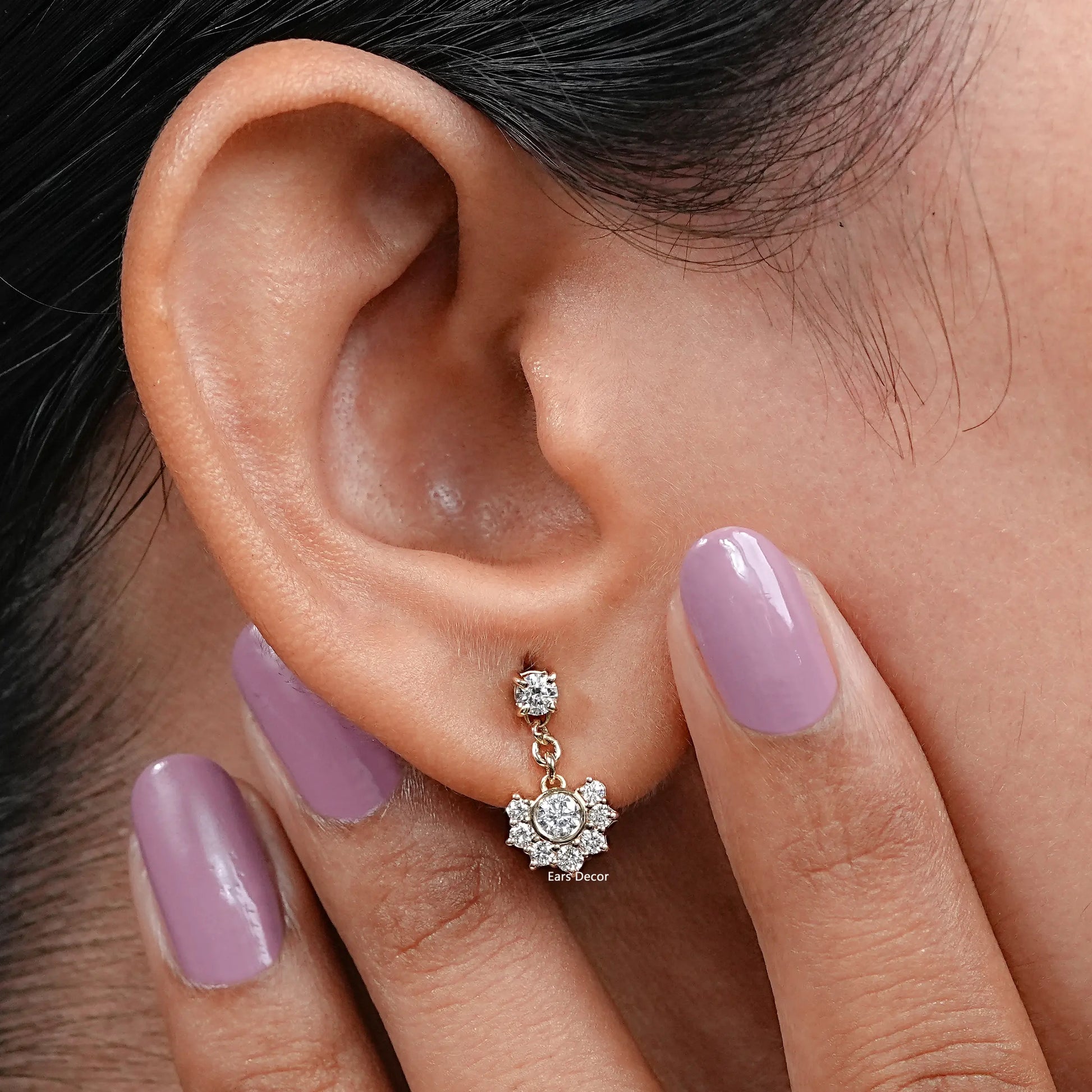 Elegant half halo dangle earrings featuring natural round diamonds for a radiant timeless look. Earth mined prong set brilliant diamond flower style dangle drop earrings.