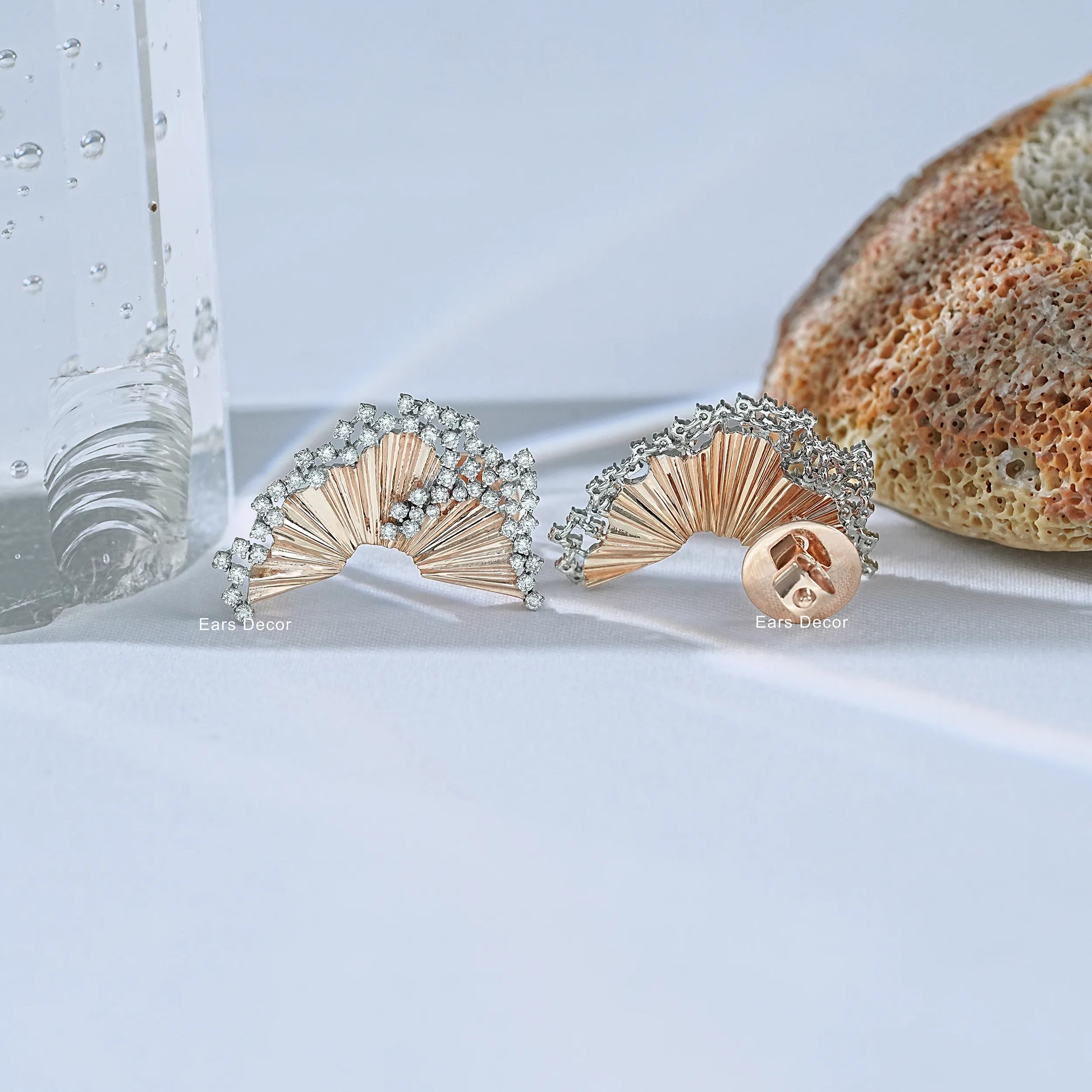 Elegant Round Cut Lab Diamond Fan-Shaped Stud Earring, showcasing two brilliantly faceted lab-grown stones arranged in a clean, fan-inspired silhouette. Designed for minimalist elegance, these studs offer refined sparkle, subtle vintage charm, and sustainable modern luxury for any look.