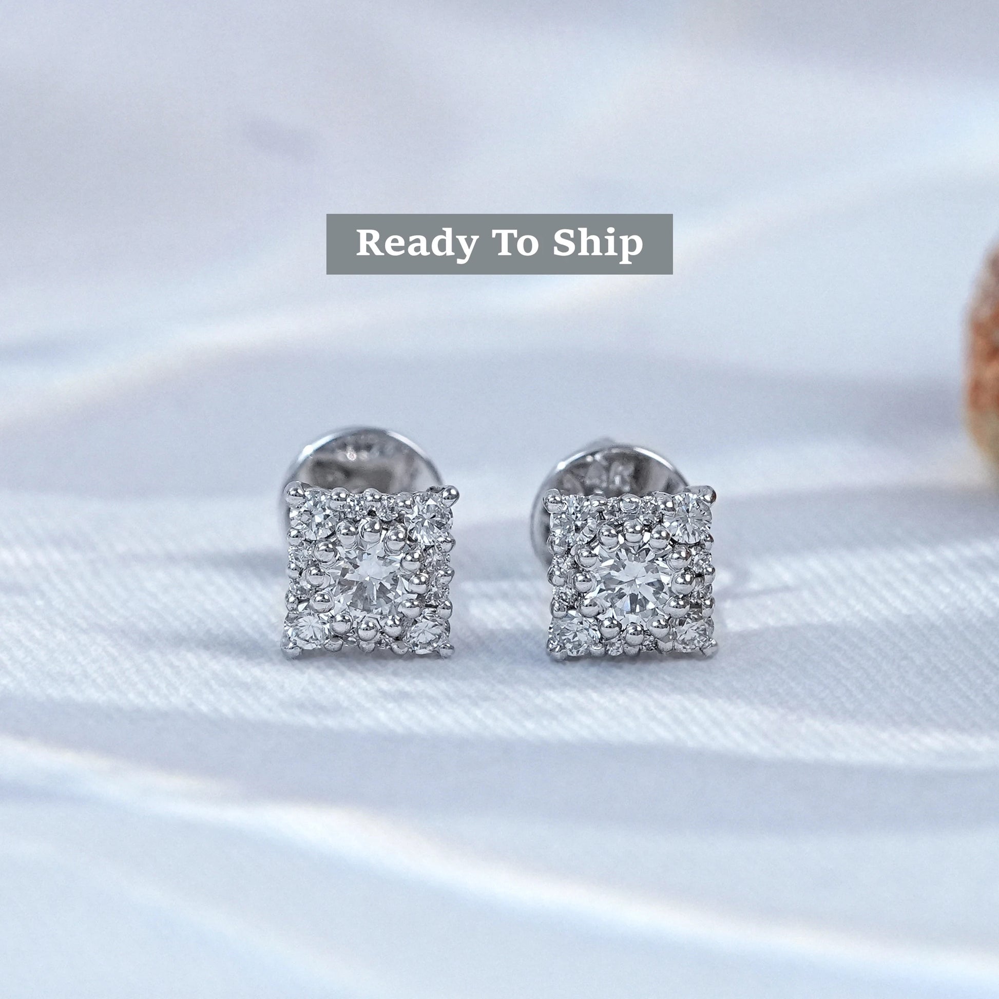 Dazzling Round Lab Diamond Halo Stud Earrings, featuring a brilliant center stone surrounded by a sparkling halo—perfect for timeless elegance and everyday sophistication.
