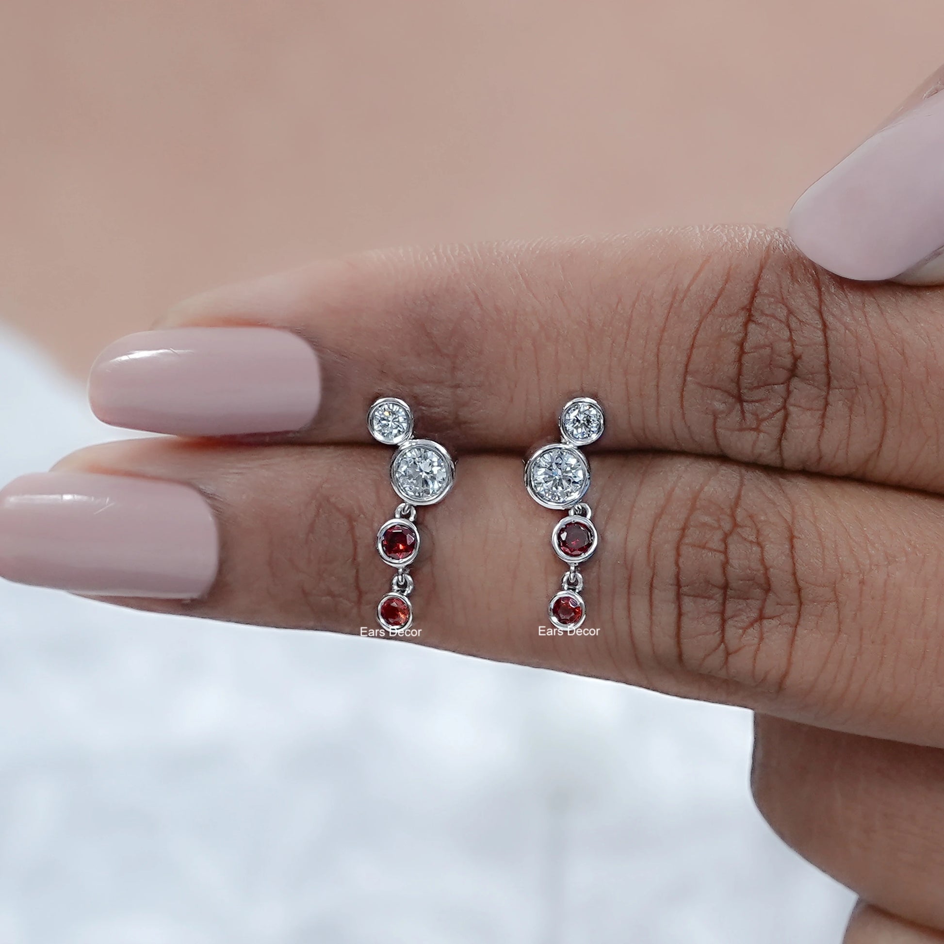 Elevate your everyday look with these stunning cluster stud earrings, featuring a harmonious trio of sparkling stones. At the center, brilliant white stones catch the light beautifully, flanked by deep red ruby-like accents that add a touch of warmth and contrast.