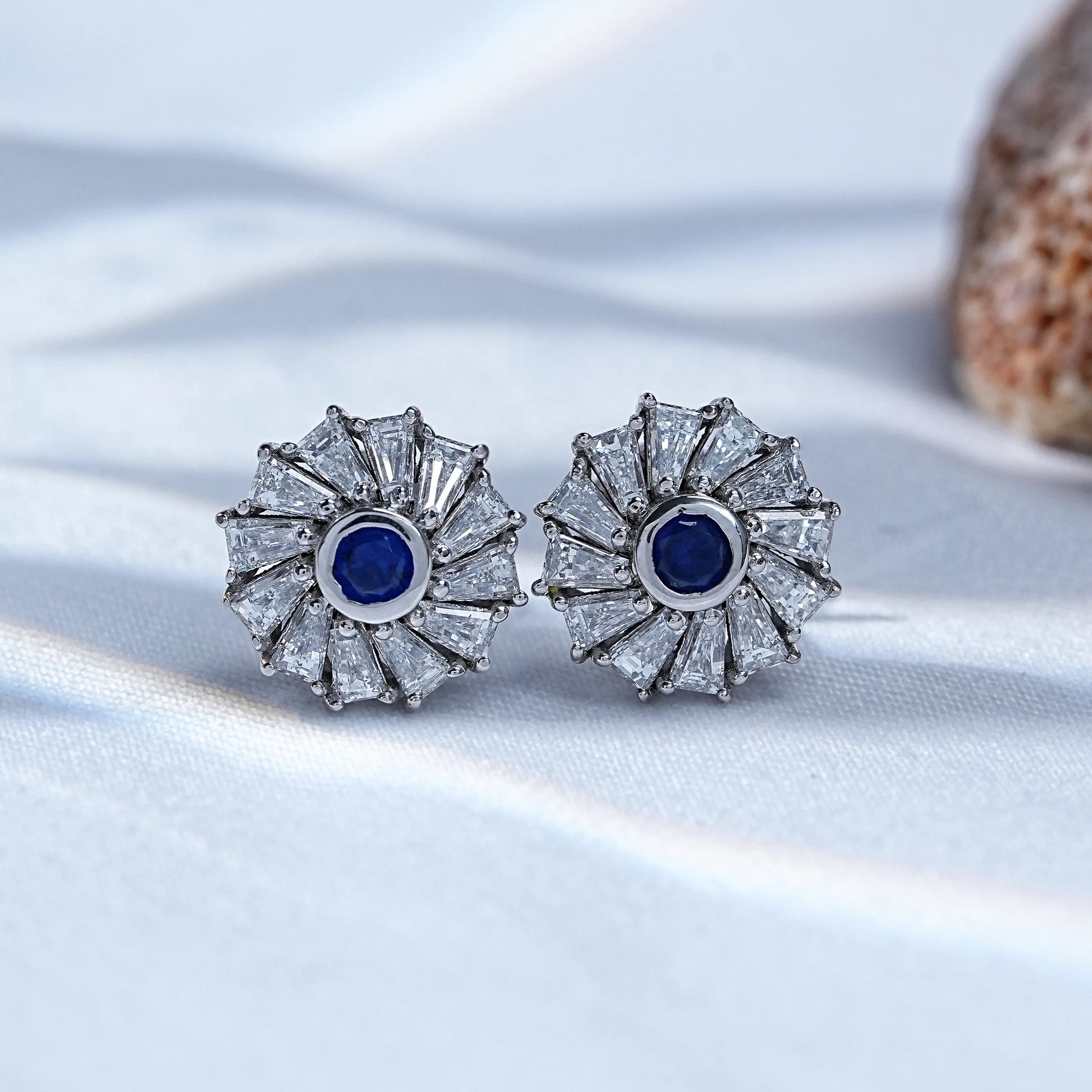 Sapphire Round And Tapered Baguette Halo Stud Earrings