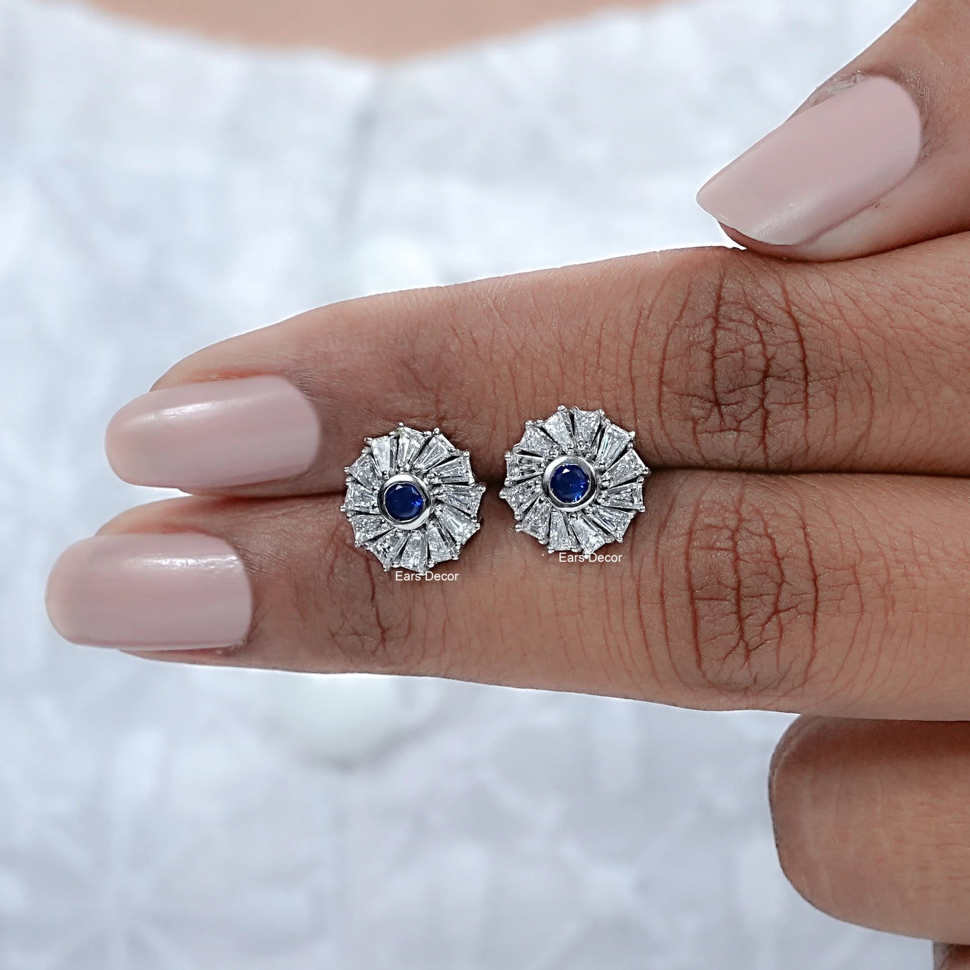 Sapphire Round & Tapered Baguette Halo Stud Earrings with a brilliant sapphire center and radiant baguette diamond halo.