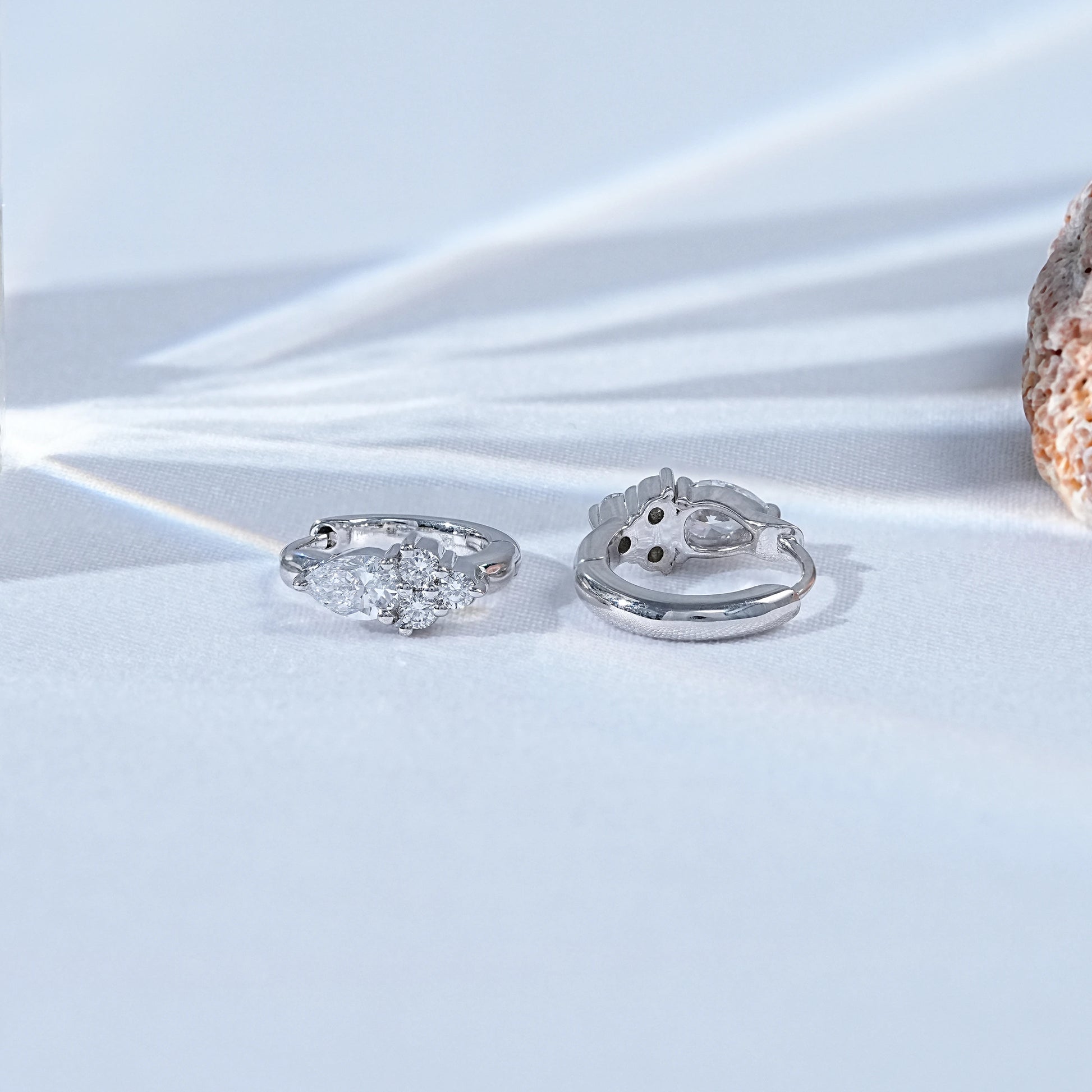 These exquisite earrings feature a dazzling cluster of diamonds set in a sleek, polished silver hoop. The elegant design combines pear-shaped and round diamonds to create a sophisticated, timeless look.