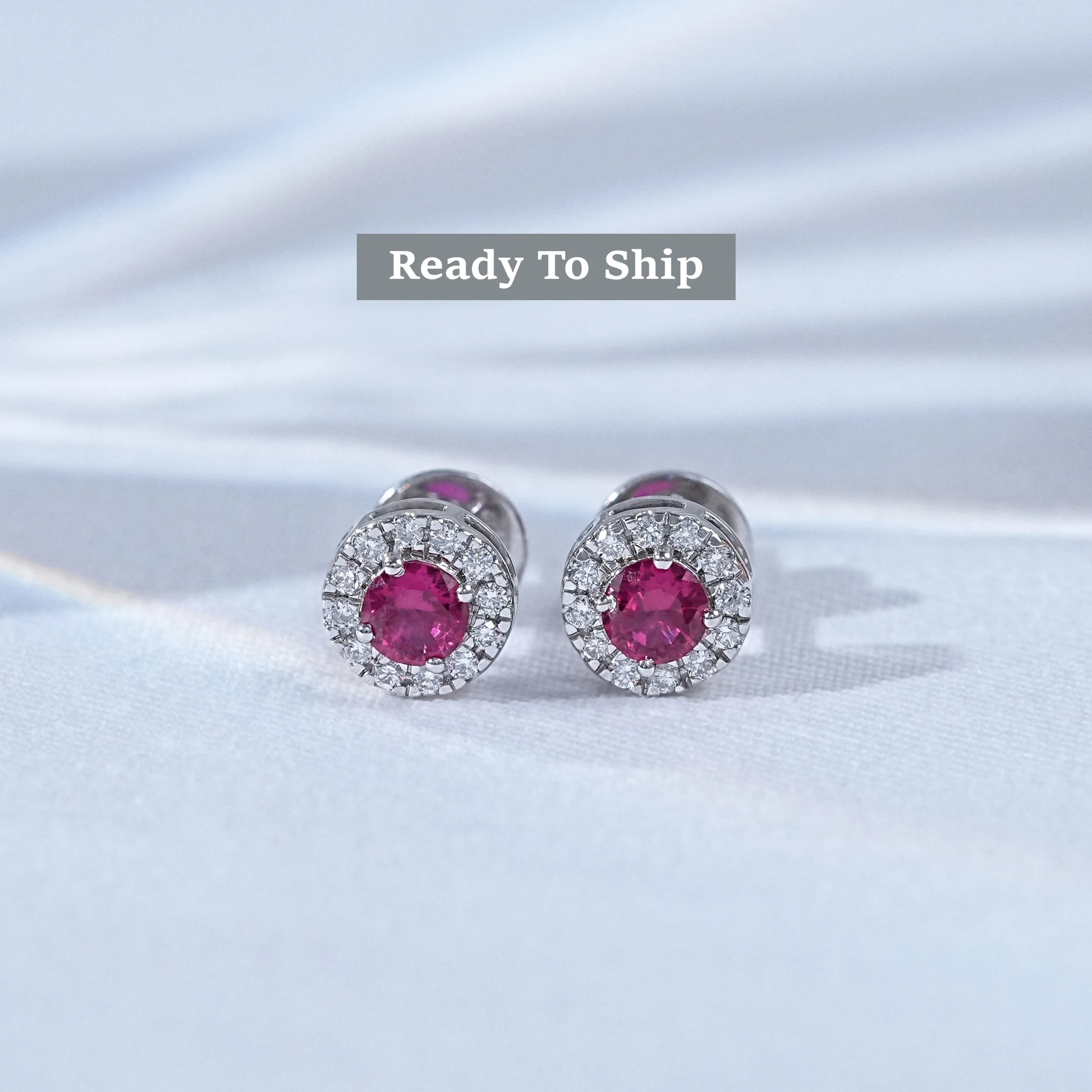 Beautiful halo stud earrings featuring vibrant pink tourmaline gemstones, surrounded by sparkling round lab-grown diamonds, set in a sleek design for an elegant touch.